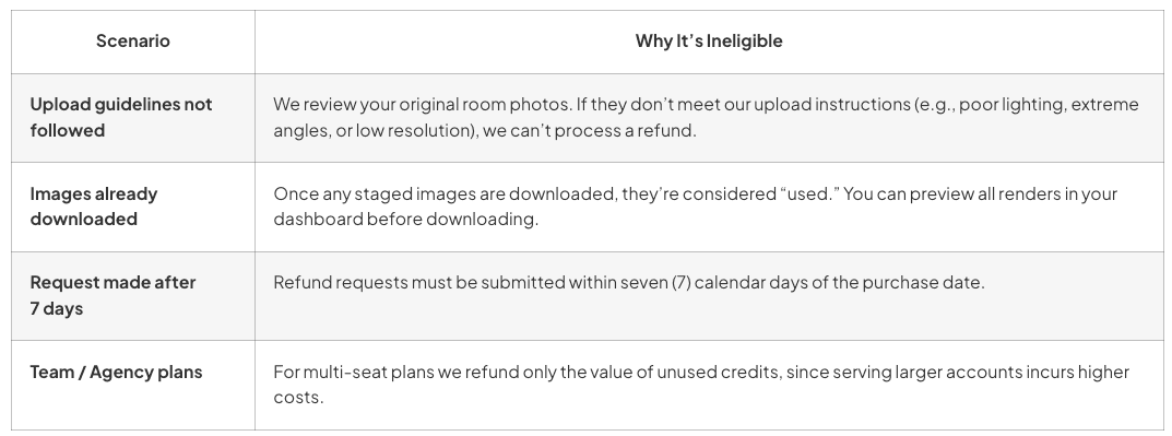 We’re confident you’ll love the AI-generated staging images we create for your listings. In the rare event that your results fall short of expectations, we’ll happily provide either a complimentary redo or a 100 % refund. Because our service is entirely digital, we’ve put safeguards in place to prevent abuse and ensure a fair experience for every customer.